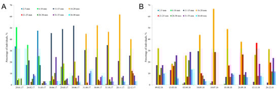 Seasonal changes of shell size structure in the Corbicula morphotype R population. Axes correspond to the eight size classes in accordance with shell length intervals. The juvenile individuals belong to a size class with shell length of 2–5 mm. (A) 2017, (B) 2018.