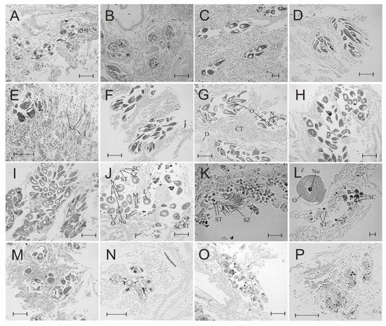 The gonads of hermaphroditic specimens of Corbicula form R at different stages of their reproductive cycle in 2017 and 2018. The state of the gonad in the final reproduction stage, showing a small number of advanced gametes: (A) 22 December 2017; (B) 26 December 2018; (C) 26 February 2017; (D) 9 February 2018. The state of gonad at the beginning of the spawning season, showing an increase in the number of advanced gametes: (E) 30 April 2017; (F) 3 April 2018; (G) 29 May 2017; (H) 18 May 2018. The state of the gonad in the first peak of the spawning season, showing a large number of advanced gametes: (I) 30 June 2017; (J) 1 August 2018. (K) Spermatocytes, spermatids, and sperm were typically in the terminal region of the ascini (1 August 2018). (L) Ascinus with advanced oocytes and developing spermatocytes (1 August 2018). The state of the gonad in the autumn months: (M) 30 September 2017; (N) 26 September 2018; (O) 28 November 2017; (P) 13 November 2018. Legend: O—oocyte, CT—connective tissue, N—nucleus, Nu—nucleolus, SC—spermatocytes, ST—spermatids, SZ—sperm, pre—(P), early—(E), mid—(M), and late—(L) vitellogenic oocytes. Scales: (A–J), (M–P) = 0.2 mm; (K,L) = 0.02 mm.