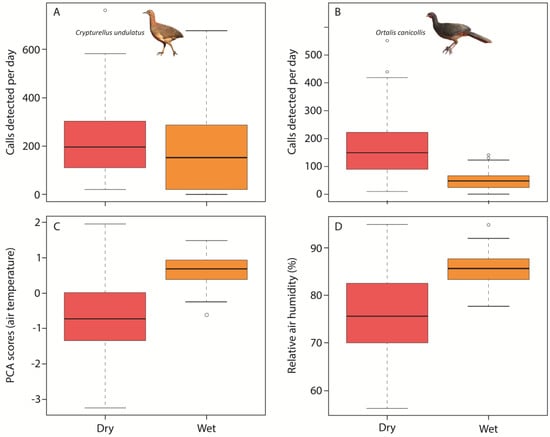 Boxplots showing the seasonal variations in the daily calling activities of the Undulated Tinamou (A) and the Chaco Chachalaca (B) in the Pantanal Matogrossense (Brazil) during the dry and wet seasons. Seasonal variations in climatic conditions are also shown. Climatic conditions are indicated by air temperature (C), and daily rainfall (D). Air temperature is represented as the scores of the first Axis of a PCA performed to summarize daily maximum, minimum and mean air temperature.