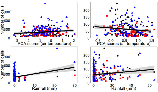 We focused our comparison during the two most different periods: the dry season (July–September) and the wet season (January–March). We reduced the potential collinearity among climatic variables following a two-step process. First, we conducted a principal component analysis (PCA) for the three air temperature variables (minimum, mean, and maximum air temperature). The scores of the first principal component were then used as a surrogate of daily air temperature in posterior analyses (air temperature hereafter). Lastly, we checked the correlation between air temperature, daily relative air humidity, and daily rainfall and removed those variables with Spearman rank correlations higher than 0.7 [48]. The daily rainfall and daily relative air humidity were highly correlated (Spearman rank correlation of 0.73), with higher relative air humidity on those days with higher daily rainfall. We decided to remove relative air humidity from further analyses because we expected a higher impact of daily rainfall on the daily vocal activity of the focal species.