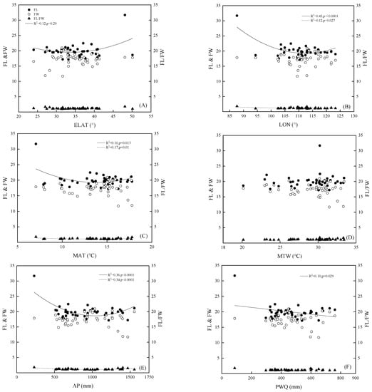 Relationship between fruit width (FW), fruit length (FL), and FL/FW with geographic and climatic factors in 43 populations of Q. variabilis. (A) relationship between morphological factors with ELAT; (B) relationship between morphological factors with LON; (C) relationship between morphological factors with MAT; (D) relationship between morphological factors with MTW; (E) relationship between morphological factors with AP; (F) relationship between morphological factors with PWQ. AP, annual precipitation; ELAT, equivalent latitude; LON, longitude; MAT, annual mean air temperature; MTW, maximum temperature of warmest month; and PWQ, precipitation of wettest quarter.