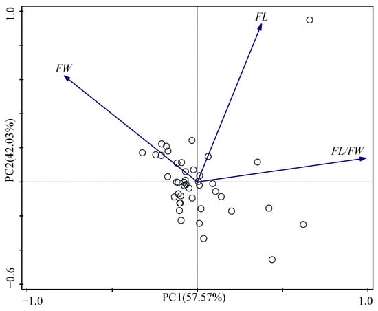 Based on the results of principal component analysis (Figure 2, Table 6), 99.60% of the total variance was explained by the first two principal components. The principal component score, associated to each variable on the three principal components, identifies the variables that mostly defined them (Table 6). The PC1, showing 57.57% of total variability, was positively correlated with following variables: FW and FL/FW. The PC2 indicated 42.03% of cumulative variance was positively correlated with FL and FW.