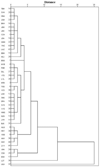 Hierarchical tree dendrogram of 43 populations of Q. variabilis based on fruit morphological characters and environmental factors.