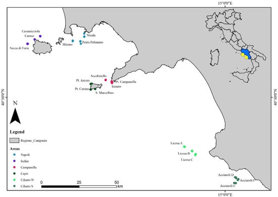 The Napoli area consists of a sand/mud substrate with scattered coralligenous banks; Ischia island is mostly characterized by a hard bottom due to the presence of cliffs and rocky outcrops of volcanic origins; the sites located in the Campanella area are represented by two rocky cliffs (P. Campanella and Ieranto) and a shoal (Secchitiello); the Capri area also consists of steep rocky cliffs; finally, the Cilento N and Cilento S areas are characterized by a succession of rocky outcrops and coralligenous banks [53,54,55].