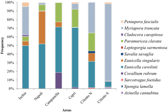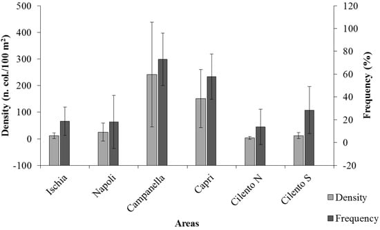 Campanella and Capri represent the areas with the highest number of organisms. In all areas, however, as evident in Figure 2, density and frequency of CSS show a regular trend, typical of a random spatial species distribution, possibly due to the absence of limiting factors controlling species eco-physiology (e.g., temperature, water, substrate type) [66].
