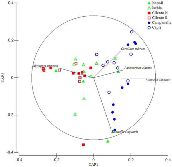 Such findings were confirmed by the CAP analysis (Figure 4), showing: a cluster composed by Campanella and Capri areas, polarized in the positive part of the CAP 1 axis, strongly related with cnidarian species, and a cluster composed by Cilento N and Cilento S areas, polarized in the negative part of the CAP 1 axis, strongly related with bryozoan species. Napoli and Ischia areas are scattered along the whole CAP 1 axis.