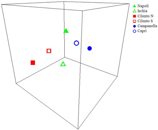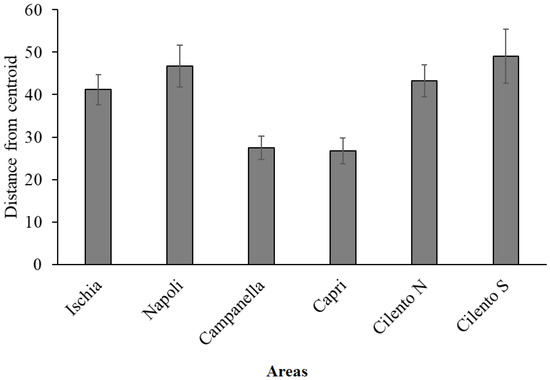 Multivariate PERMANOVA analysis on the species densities dataset showed significant differences both among sites (p = 0.0002) and areas (p = 0.0066); in particular, pairwise tests show that Cilento N and Cilento S were significantly different from Campanella and Capri (p < 0.05). Indeed, the PERMDISP analysis (p = 0.0076), and measure of β-diversity in terms of small-scale heterogeneities, showed the lowest values for Campanella and Capri and the highest values for the other areas (Figure 5).