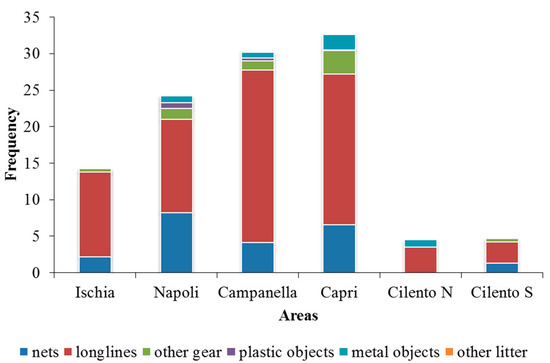 Campanella and Capri are the most stressed areas with the highest numbers of fishing gear and marine litter, followed by Napoli and Ischia, while Cilento N and Cilento S are the least stressed ones with very low values. Generally, longlines dominate in all the sampled areas, followed by nets, with very high numbers in Campanella and Capri. Nets are more abundant in the Napoli area, where the coralligenous bioconstructions are present in the form of banks surrounded by muddy substrate. Longlines are widespread because of their dual-source from both professional and recreational fishing, while nets should be considered mainly professional gear [78]. Moreover, longlines can be used on different bottom types, while the nets are usually set on soft bottoms, even though they may get stuck on hard bottom, with relevant damages for the benthic communities [32,79,80].