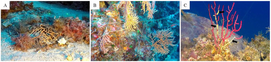 Mesophotic reefs are threatened by several anthropogenic impacts, such as fishing, pollution, introductions of alien species and climate change [20,21]. These impacts may lead to structural and functional changes, altering trophic webs and transferring organic and inorganic contaminants to the food chain, thus influencing ecosystem functioning and ultimately human health [22,23]. Fishing gear, such as trawling nets and longlines, has a high impact on benthic communities by entangling organisms, mechanically damaging the erect species, and increasing turbidity and sediment accumulation [24,25,26,27,28,29,30]. Specifically, the entangled colonies may be broken and upturned by gear reaching out to tissue necrosis and subsequent epibionts overgrown [31,32,33]. The recovery of coralligenous species from damage can negatively affect the regenerative process, the growth, the reproduction, the resistance to diseases, and the competitive ability of the colonies [34,35].