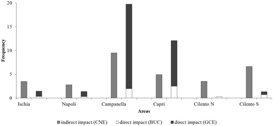 Frequencies of indirect (CNE) and direct (BUC and GCE) impacts detected in each area.