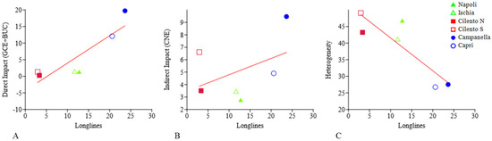 Linear regressions between longlines and direct impact ((A), p = 0.0086, r2 = 0.77), indirect impact ((B), no correlation), and heterogeneity ((C), p = 0.035, r2 = 0.77).