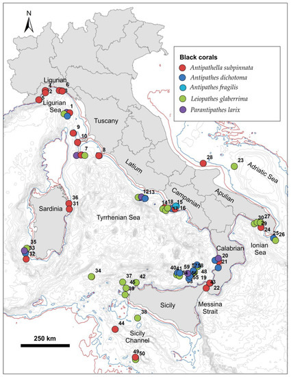 Within the Italian seas, five species of black corals have been reported: Antipathes dichotoma Pallas, 1766 and Antipathes fragilis, Gravier, 1918 (both Antipathidae), Leiopathes glaberrima (Esper, 1972) (Leiopathidae), Antipathella subpinnata (Ellis & Solander, 1786) (Myriopathidae), and Parantipathes larix (Esper, 1788) (Schizopathidae). Actually, the latter was lost and its taxonomic position is highly dubious [5]. Such corals are mainly found in a water depth of 60 m to 300 m [4,6], forming characteristic ecological niches hosting rich associated fauna and attracting numerous species of commercial interest [1,7].
