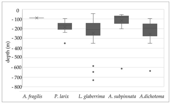 Bathymetric distribution of five black corals in the Italian seas (Outliers are marked with circles and the mean with x symbol).