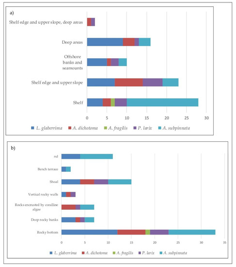 In the Italian seas, black corals were found in different environmental settings, varying from shelf, shelf edge and upper slope, offshore banks and seamounts, and deep areas (Figure 4a). In detail, A. subpinnata displays the widest distribution, occurring in all above-mentioned settings with a maximum frequency on the shelf. Antipathes dichotoma, L. glaberrima, and P. larix are reported from the shelf, shelf edge and upper slope, offshore banks and seamounts, and deep areas. Parantipathes larix and A. dichotoma mainly occur in the shelf edge and upper slope, whereas L. glaberrima in the deep areas. Antipathes fragils is only reported from the shelf. The black corals observed in the Italian seas are settled on different exposed substrates represented by the rocky bottom, deep rocky banks, rocks encrusted by coralline algae, shoal, terrace, and vertical rocky walls (Figure 4b). The most common substrate types associated with these corals is represented by rocky bottom. A minor percentage, excluding A. fragils, were also associated with shoal, deep rocky banks, and rocks encrusted by coralline algae. Finally, in very few cases they were occurring on terraces and vertical rocky walls (Figure 4b).