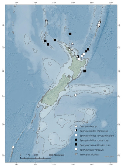 Stenopodidean shrimps inhabit all oceans, with an overall pan-tropical distribution and the highest diversity centered in the Indo-West Pacific [3]. The most northern record was provided by Hansen [18] off Iceland, in the Atlantic, the most northern record in the Pacific is Japan, while South Africa, Tasmania and New Zealand represent the southern latitudinal boundaries of this group [12,19,20,21]. However, the New Zealand stenopodideans have historically received limited attention. The known fauna currently only comprises three species: the first record was provided by Yaldwyn [22] for the banded coral shrimp Stenopus hispidus Olivier, 1911 [23] from northern New Zealand, followed by Spongiocaris yaldwyni Bruce & Baba, 1973 [21] from the Bay of Plenty off the central North Island, which remained the only specimen record of this species to date (gene sequences were for one sample were recently presented by Chen et al. [17] from Tonga), and Spongicoloides novaezelandiae Baba, 1979 [20] from the Chatham Rise off the South Island. The latter species was recently reported by Goy [13] with a broad Indo-Pacific distribution, but records are either referred to other species or called into doubt in this study.