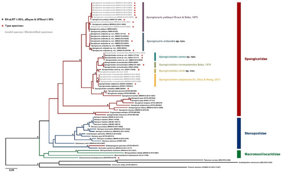 The phylogenetic trees inferred from ML analysis was generally well supported (Figure 2). Our findings show the ingroup (Stenopodidea) was recognized as a monophyletic group with high support values. At the familial level, Macromaxillocarididae was at the basal position and monophyletic, but with weak support. The monophyly of the other two families, Spongicolidae and Stenopodidae was not supported, as the spongicolid genus Globospongicola Komai & Saito, 2006 [8] was embedded in the Stenopodidae clade. At the generic level, Stenopus, Spongicola, Spongiocaris and Spongicoloides were suggested to be non-monophyletic, which was generally in accord with the results of previous phylogenetic studies [10,17]. Specifically, Stenopus, Spongicola and Spongiocaris are paraphyletic, while the species of Spongicoloides formed a polyphyletic assemblage. At the specific level, all the species were well separated. Significantly, our tree suggested that Spongiocaris neocaledonensis should be the synonym of S. yaldwyni, and some specimens previously identified as Spongicoloides novaezelandiae in Goy [13] are actually S. weijiaensis Xu, Zhou & Wang, 2017 [36] or S. sonne sp. nov. These findings are discussed further under the species below.