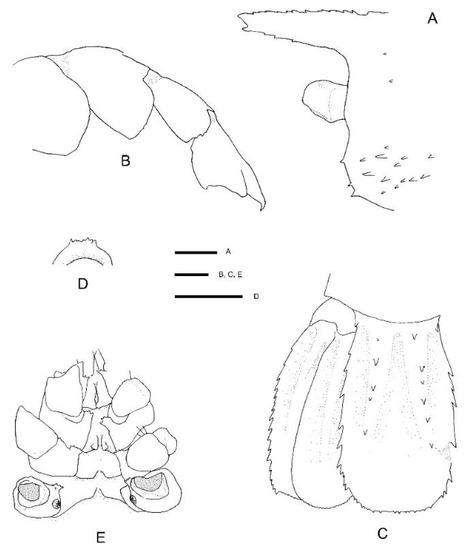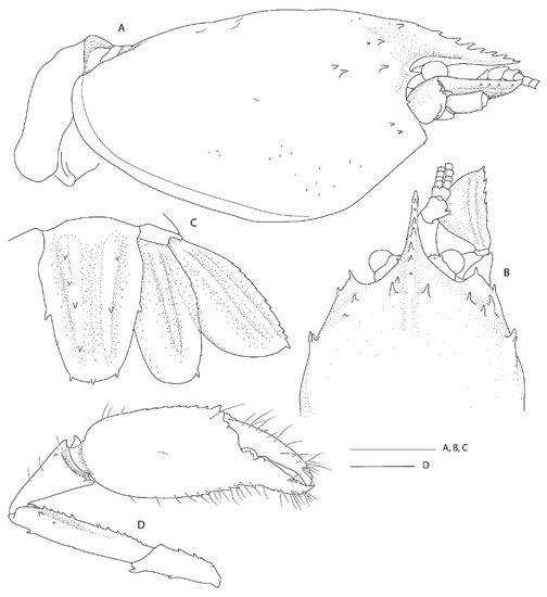 - Poore, G.C.B. Marine Decapod Crustacea of Southern Australia. A Guide to Identification (with Chapter on Stomatopoda by Shane Ahyong); CSIRO Publishing: Melbourne, Australia, 2004; p. 574. [Google Scholar]