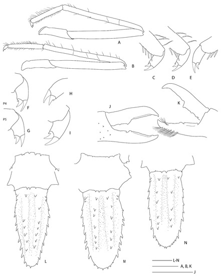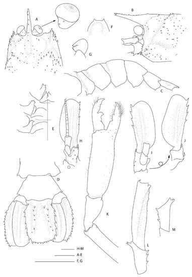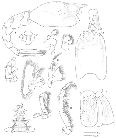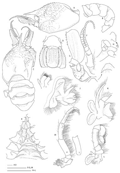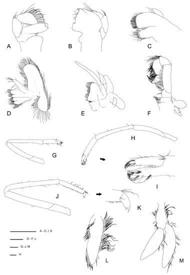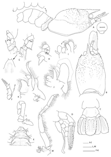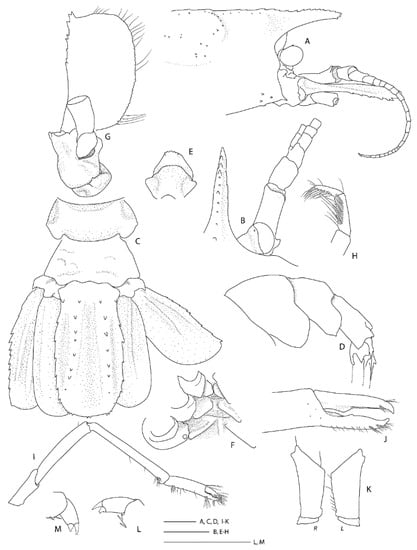 Spongicoloides novaezelandiae Baba, 1979 [20], holotype M (NMNZ CR.001889). (A) Anterior carapace and cephalic appendages, lateral. (B) Rostrum, right ocular peduncle and antennule, dorsal. (C) Pleonites 5 and 6, urosome and telson, dorsal. (D) Pleonites 4–6 and proximal urosome and telson, lateral. (E) Epistome and labrum, ventral. (F) Thoracic sternites 6–8 with coxae of pereiopods, ventral. (G) Right antenna, ventral. (H) Distal portion of Mxp3 showing the setiferous organ on propodus. (I) Right P1, lateral. (J) P3 fingers and distal palm, mesial. (K) Right (R) and left (L) ischia of P3, lateral. (L) Left P4 or P5 dactylus and distal propodus. (M) Right P5 dactylus and distal propodus. Scale bars = 2 mm.