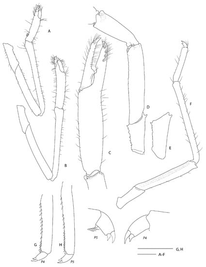 Spongicoloides clarki sp. nov., holotype F ov. (NIWA 118650). (A) P1, left, lateral. (B) P2, left, lateral. (C) P3, fingers, palm and distal carpus, right, outer surface. (D) P3, carpus, merus and ischium, right, mesial. (E) P3, ischium, left, lateral. (F) Left P4 lateral. (G) Right P4 propodus and dactylus, lateral. (H) Right P5 propodus and dactylus, lateral. Detail of P4 and P5 dactyli without scale. Scale bars = 2 mm.