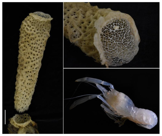 - Saito, T.; Tsuchida, S.; Yamamoto, T. Spongicoloides iheyaensis, a new species of deep-sea sponge-associated shrimp from the Iheya Ridge, Ryukyu Islands, Southern Japan (Decapoda: Stenopodidea: Spongicolidae). J. Crustac. Biol. 2006, 26, 224–233. [Google Scholar] [CrossRef]