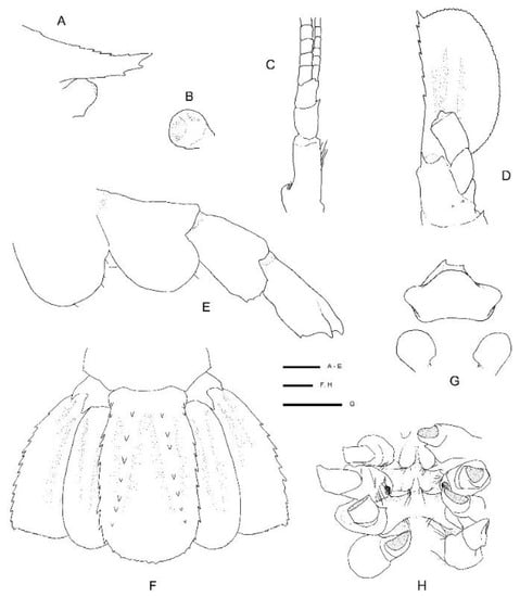 Spongicoloides novaezelandiae Baba, 1979 [20], F (NIWA 40567). (A) Rostrum, lateral. (B) Left eye, outer view. (C) Left antennule, dorsal. (D) Left antennal scale, dorsal. (E) Third to sixth pleura, lateral. (F) Telson and uropods, dorsal. (G) Epistome, labrum and paragnaths, ventral. (H) Thoracic sternites, ventral. Scale bars = 1 mm.