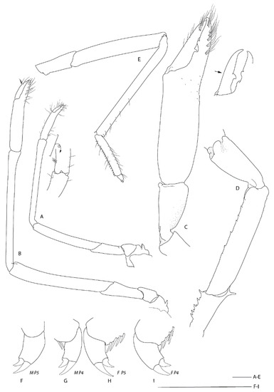 Fourth and fifth pereiopods long and slender, similar, sparsely setose; dactylus about one-fifth the length of propodus, biungulate, both unguis clearly demarcated, both P5 with small accessory tooth on dorsal margin, right P5 with obsolescent accessory tooth on ventral margin proximally (P4 dactyli missing or damaged); propodus not subdivided, about 0.5 × carpal length, P5 propodus as wide as P4 propodus, with single row of 19–21 (P4) and 21 (P5) movable spine along entire flexor margin, both margins with few long, simple setae; carpus longest, not subdivided, with movable spine at distoventral angle; merus about 0.7 (P4)–0.7 (P5) × carpal length, unarmed; ischium about half length of merus, unarmed. Basis and coxa short, coxa mesially with dense setae, unarmed. Epipod absent.