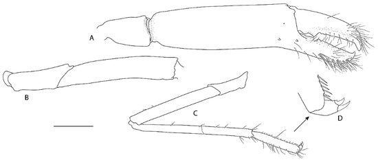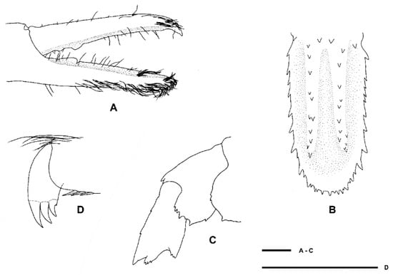 Spongicola goyi Saito & Komai, 2008 [12], F ov. (NIWA 127123). (A) Carapace and anterior pleonal segments, lateral. (B) Anterior portion of carapace and cephalic appendages, dorsal. (C) Telson and uropods, dorsal. (D) Third pereiopod, lateral. Scale bars = 2 mm.