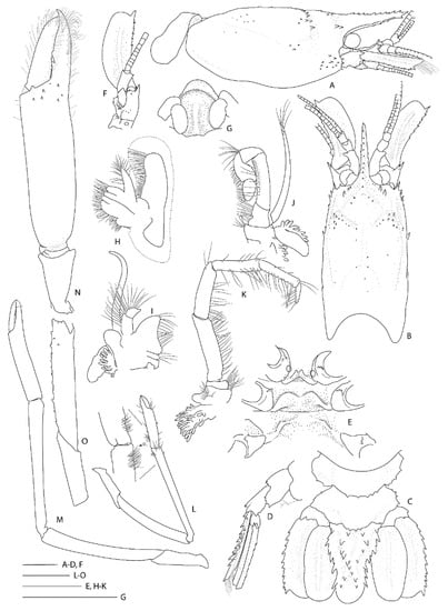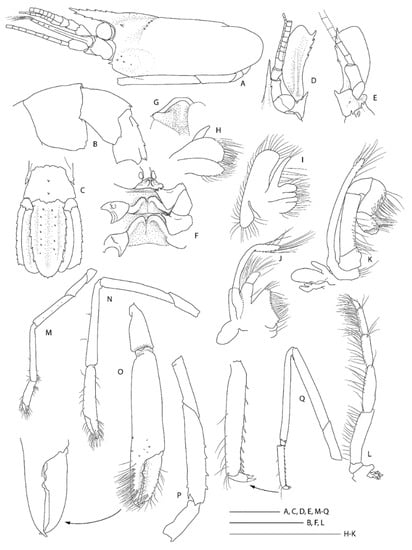 Morphological terminology and measurements follow Goy [3]. Measurements of specimens are given in millimeters (mm). Postrostral carapace length (PCL) is measured along the dorsal midline, from the posterior end of the orbit to the posterior margin of the carapace; total carapace length (CL) is measured from the anterior end of the rostrum to the posterior end of the carapace; total body length (TL) is measured from the tip of the rostrum to the posterior end of the telson. Specimens were measured and illustrated using a MZ9.5 (KS, Leica, Heerbrugg, Switzerland) and SteREO Discovery V8 (QK Zeiss, Oberkochen, Germany) stereomicroscope. Line drawings and color plates were made using a Intuous Pro Graphics Tablet (WACOM, Saitama, Japan), Adobe Illustrator CS6 and Adobe Photoshop 2020 (KS) and CS4 (QK) (Adobe, San Jose, CA, USA); sample records were mapped using ArcGIS Pro version 2.6.1 (ESRI, Redlands, CA, USA) and a NIWA Basemap (Mercator 41 Projection, NIWA 2018) using maps based on NIWA Regional Bathymetry data (https://niwa.co.nz/our-science/oceans/bathymetry/download-the-data (accessed on 12 July 2021)).