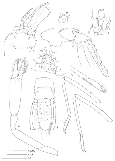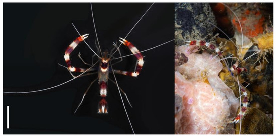 - Saito, T.; Anker, A. Two new species and new records of Microprosthema Stimpson, 1860 (Crustacea: Decapoda: Stenopodidea: Spongicolidae) from the Indo-West Pacific. Zootaxa 2014, 3857, 24. [Google Scholar] [CrossRef]