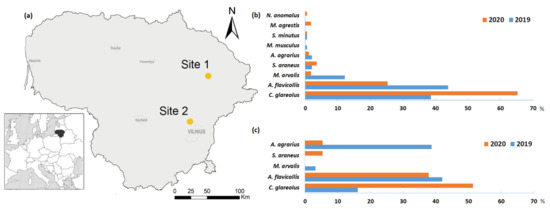Location of the study sites in Lithuania (a): Site 1, homestead (55.444 N, 25.464 E), Site 2, kitchen garden (54.822 N, 25.104 E), and compositions of the small mammal community in 2019 and 2020 at Site 1 (b) and Site 2 (c).