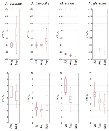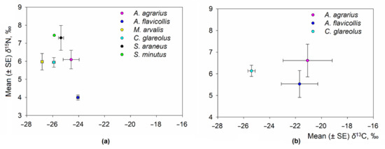 Based on the limited data series (three months of sampling, July to September), a decrease in the δ13C values was observed in the hair of the herbivorous M. arvalis, while an increase was observed in the hair of the granivorous species A. flavicollis and A. agrarius. As for δ15N values, a decrease towards autumn was observed in the hair of the herbivorous M. arvalis and omnivorous C. glareolus (Figure 4).