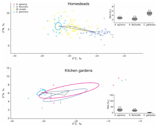 On Peromyscus mice, it was shown that use of agricultural land is not reflected in δ13C values [56], but feeding ecology and population density is affected. Densities are also affected by human-related food in other omnivorous mammals, including carnivores [57]. It also remains unclear though whether δ13C levels depend on the use of processed food and other human-related products. In our case, the omnivore in the commensal habitats was C. glareolus, and its central position of δ13C was fully separated in the kitchen garden from its nearest competitor A. agrarius, with the central trophic niche overlapping by just 1.27% (see Figure 2 and Figure 3).