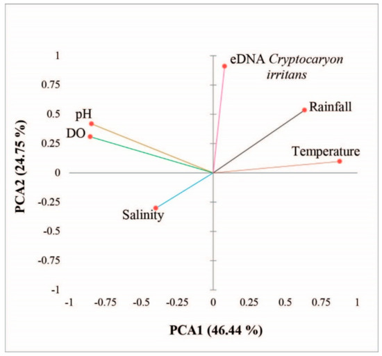 Two most important components of principal component analysis (PCA), showing relationship among variables: abundance of Cryptocaryon irritans water (eDNA), rainfall, temperature, dissolved oxygen, pH, and salinity for five fish sea cages between January and August 2020 from Hong Kong.