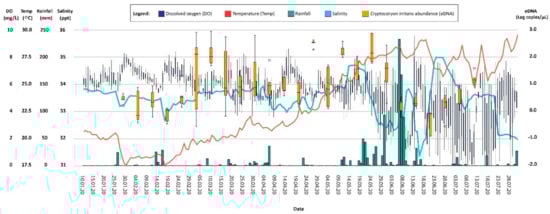 Cryptocaryon irritans loads increased between March and May 2020. Figure 3 summarizes the seasonality of C. irritans abundance, physical-chemical and the environmental parameters (dissolved oxygen, water temperature, rainfall and salinity) during the seven months period of water collection. C. irritans abundance (eDNA) followed mainly the trends of increasing temperature and rainfall and decreased dissolved oxygen levels. C. irritans loads were particularly high in May 2020, when temperatures surpassed 25 °C, dissolved oxygen readings were consistently dropped below 6 mg/L and rainfall was intensifying in Hong Kong (Figure 3).