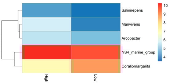 Heatmap clustered by rows showing the DESeq2 normalized abundance of the bacterial gener with a significant relationship with the high and low abundance of C. irritans (eDNA- based on mean values of C. irritans 18S SSU-rDNA gene copies/uL using digital droplet PCR quantification) from marine fish sea cages from Hong Kong.