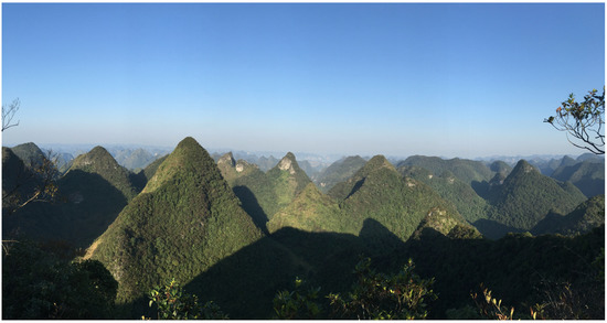 - Liu, Z.Q.; Xiong, K.N.; Li, G.C.; Xiao, S.Z.; Wang, L.Y.; Wang, H.S.; Luo, D. Geomorphologic value and contributions of the Huanjiang Karst Extension to South China Karst World Heritage. Carsologica Sin. 2014, 33, 64–76. [Google Scholar]