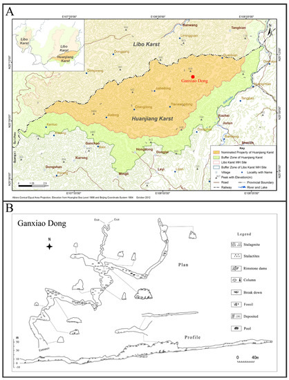 Location of Ganxiao Dong (A) and map of the cave (B).