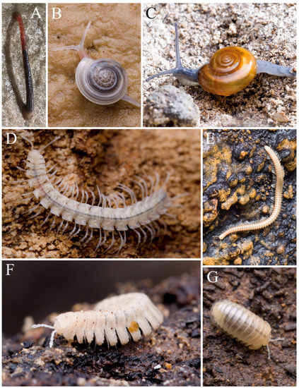 Cave animals in Ganxiao Dong: (A) leech Sinospelaeobdella sp.; (B) snail Euplecta sp. and (C) snail Chalepotaxis sp.; (D) Pacidesmus bedosae Golovatch et al., 2010; (E) Glyphiulus proximus Golovatch et al., 2011; (F) Eutrichodesmus similis Golovatch et al., 2009; (G) Hyleoglomeris kunnan Golovatch et al., 2012.