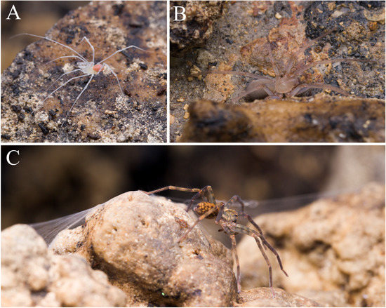 Harvestman and spiders in Ganxiao Dong. (A) Epedanidae sp.; (B) Troglocoelotes proximus (Chen, Zhu & Kim, 2008); (C) Sparassidae sp.