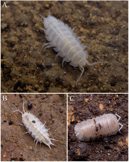 Woodlice in Ganxiao Dong. (A) Trogloniscus trilobatus Taiti & Xue, 2012; (B) Trogloniscus deharvengi Taiti & Xue, 2012; (C) Dryadillo sp.