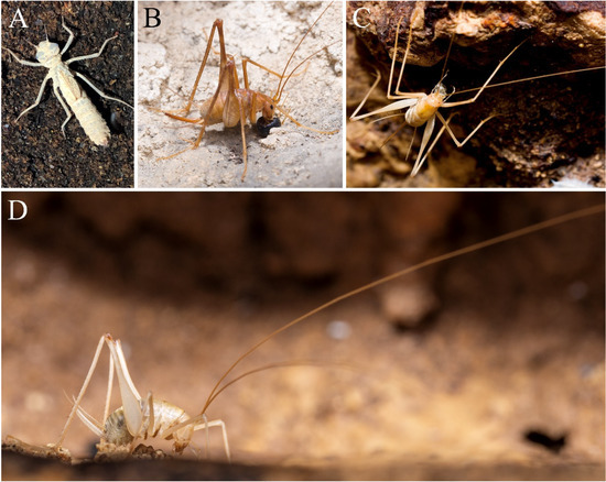 Dragonfly and crickets in Ganxiao Dong. (A) Nymph of Sarasaeschna sp.; (B) Tachycines (Gymnaeta) sp.1; (C) Tachycines (Gymnaeta) ferecaecus (Gorochov, Rampini & Di Russo, 2006); (D) Tachycines (Gymnaeta) sp.2.
