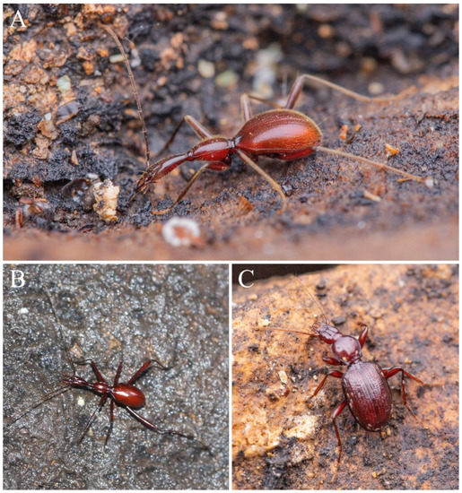 Ground beetles in Ganxiao Dong. (A) Pilosaphaenops hybridiformis (Uéno, 2002); (B) Sinaphaenops wangorum Uéno & Ran, 1998; (C) Libotrechus nishikawai Uéno, 1998.