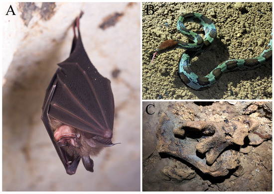 Other vertebrates in Ganxiao Dong. (A) Rhinolophus pearsonii Horsfield, 1851; (B) Elaphe moellendorffi (Boettger, 1886); (C) Fossil of Stegodon sp.