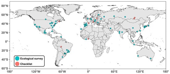 World map showcasing the locations of studies compiled in Table 1. Points show urban locations for which ant species richness estimates were available. Color indicates the type of study (i.e., ecological survey or checklist, see legend).