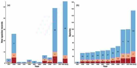 Beyond assessing the number of species in cities, another crucial component to consider is the composition and identity of the species present. Indeed, cities can facilitate invasions by non-native species in part due to their high level of disturbance, which provides ecological niches suitable for many exotic species [,,]. Moreover, the constant flux of merchandise in and out of urban centers through airports, harbors, and train stations make them the ideal gateways for exotic species introductions with the common arrival of new propagules [,,]. Consequently, surveying urban centers and their surroundings to detect new arrivals is essential to limit their spread and mitigate their potential impact on native biodiversity. This is especially true for coastal regions, which host the highest richness of exotic species [], and, in the case of China, may represent a source of spread towards more inland regions [].