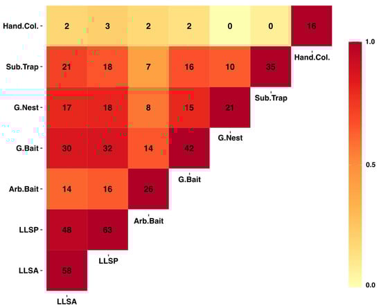 - Yusah, K.M.; Fayle, T.M.; Harris, G.; Foster, W.A. Optimizing diversity assessment protocols for high canopy ants in tropical rain forest. Biotropica 2012, 44, 73–81. [Google Scholar] [CrossRef]