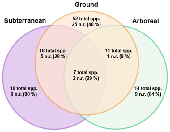 To date, the majority of studies have been limited to ecological studies (Table 1), limited in time and space, and using only a subset of sampling methods to characterize urban ant communities. However, establishing an exhaustive list of a region’s ant fauna presents multiple concerns and challenges. For instance, within a specific habitat, and especially within tropical regions, distinct ant species are stratified along the vertical strata (i.e., from underground to the canopy) [,,,,]. Generally, ants can be classified into three broad categories: arboreal, epigeic (i.e., ground surface-dwelling, including ants living in leaf litter), and hypogeic (i.e., subterranean). To perform a complete inventory of ants within a region, surveys should, thus, include the different dimensions of this vertical stratification by using methods targeting species from each microhabitat. Unfortunately, most studies in urban habitats use sampling methods focusing mainly or solely on epigeic ants [], thereby potentially under-estimating the species richness and composition of local communities, as well as the magnitude of invasions. Additionally, this may misrepresent the diversity of hypogeic and arboreal ants within urban habitats and overlook the potential discovery of undescribed species [,,].