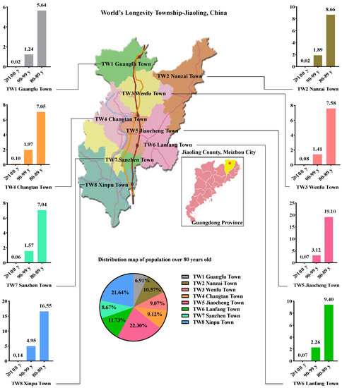 Jiaoling County is affiliated to Meizhou City, which is located in the northeast of Guangdong Province. In the eight towns of the county, the proportion of the population over the age of 80 (in a total population over the age of 80 approximately 8365 people) was 6.91%, 10.57%, 9.07%, 9.12%, 22.30%, 11.73%, 8.67%, and 21.64%, respectively. The largest and smallest elderly populations were found in Jiaocheng (TW5 samples) and Guangfu (TW1 samples), respectively (Figure 1). According to the proportion of the population aged 80–89, 90–99, and >100 to the total population over 80, Xinpu (TW8 samples) had the highest proportion of centenarians, followed by Changtan (TW4 samples), while Nanzhai (TW2 samples) had the lowest (Figure 1). The proportion of centenarians tended to increase from north to south along the Shiku River.