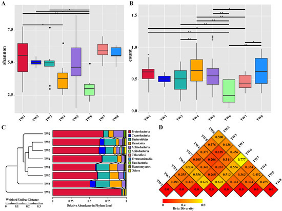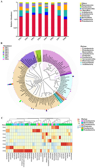 Based on the OTU analysis and clustering, shared and unique OTUs were identified in different groups. Overall, 137 OTUs were shared in the TW1–TW8 samples, and the number of unique OTUs in each group was 399, 98, 246, 139, 900, 138, 217, and 143, respectively (Supplementary Materials Figure S1A). Based on the species annotation, the top ten most abundant bacteria at each classification level (phylum, class, order, family, and genus) were identified in each sample group, and a cumulative bar map of species relative abundance was generated to allow visual assessment of the relative bacterial abundance and their proportions at the different classification levels in each sample. The relative abundance at the phylum level is presented in a histogram (Figure 2A). The major abundant phyla were Proteobacteria, Cyanobacteria, Bacteroidetes, Firmicutes, Actinobacteria, Acidobacteria, Chloroflexi, Verrucomicrobia, Fusobacteria, and Planctomycetes. Among these, bacteria from Proteobacteria, Bacteroidetes, and Firmicutes were dominant at all taxonomic levels.
