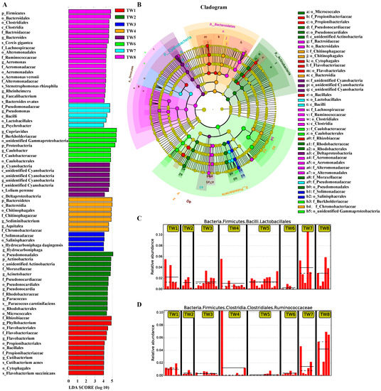 The alpha diversity index analysis of differences between groups is used to determine whether the overall community structure in different groups is significantly different. Then, the species responsible for this difference are identified using LEfSe and ternary plot analysis. The identified species constitutes a group biomarker. A histogram of the different species LDA value distribution by LEfSe analysis is shown in Figure 4A, and an evolutionary branch diagram of the different species is shown in Figure 4B. The former revealed biomarker genera with LDA scores greater than four, namely, Phyllobacterium, Flavobacterium, and Cutibacterium in TW1; Acinetobacter, Pseudonocardia, and Paracoccus in TW2; Hydrocarboniphaga in TW3; Sediminibacterium and Aquitalea in TW4; unidentified Cyanobacteria in TW5; Cupriavidus and Caulobacter in TW6; Pseudomonas, Lactobacillales (Figure 4C) and Psychrobacter in TW7; Bacteroides, Ruminococcaceae (Figure 4D), Aeromonas, Rheinheimera, and Faecalibacterium in TW8 (Figure 4).
